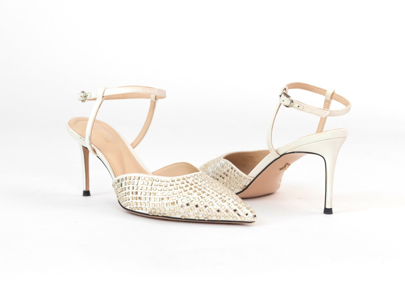 Mirage – en elegant hæl udsmykket med champagnefarvede krystaller, der fanger lyset og opmærksomheden med hvert skridt.